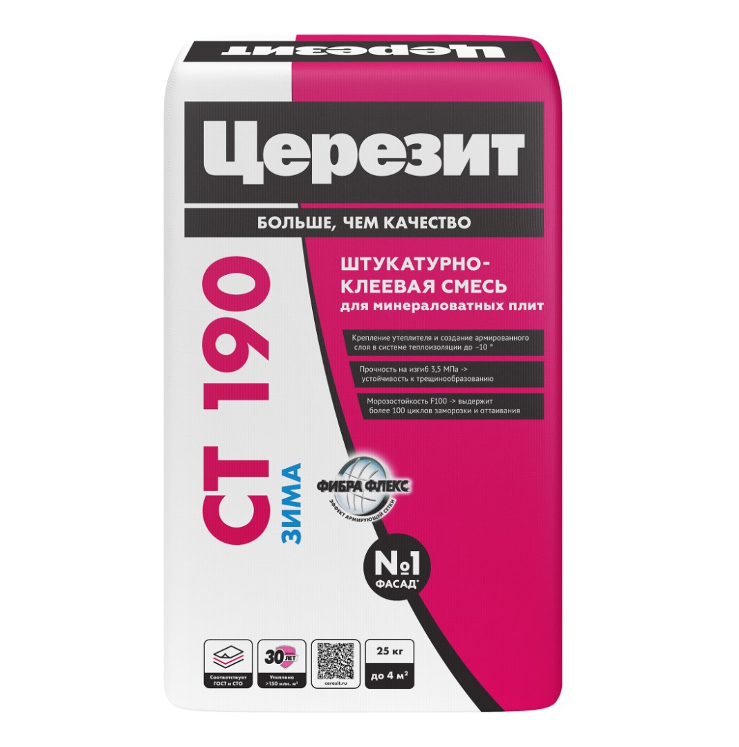 Состав штукатурно-клеевой смеси CT 190 «Зима» подходит для установки наружной теплоизоляции при низких температурах даже на фасадах неотапливаемых зданий. На ней надежно крепятся минераловатные плиты в системах Ceresit WM. Предназначена для работ на основаниях минерального происхождения и устройства базового, армированного стеклосеткой слоя штукатурки.