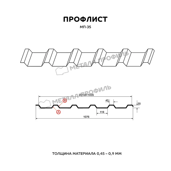 Профлист МЕТАЛЛ ПРОФИЛЬ МП-35x1035-B (VikingMP-01-8017-0,45) широко применяется для монтажа профилированного листа. Представляет собой стальной оцинкованный лист с покрытием. Общая толщина стальной основы с цинковым и полимерным слоем — 0.45 мм. Проходя процедуру холодного проката, металл принимает волнообразный вид. Такая форма придает профилю жёсткость.Профиль МП-35:
