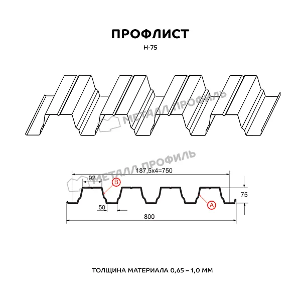 Профиль Н-75 также называют самонесущим. Это связано с его способностью обходиться небольшим числом опор. При этом он переносит значительные нагрузки, благодаря выступам на горизонтальных и вертикальных поверхностях трапециевидного профиля. Н-75 универсальный стройматериал – он может использоваться для обустройства крыш, строительства заборов, облицовки стен и потолков. Также он выступает базовым рабочим материалом при сооружении каркасных конструкций, монтаже бетонной опалубки. Высокая устойчивость к ржавению, УФ-лучам, прочность на изгиб и долгий срок службы – исключительное сочетание свойств Н-75 позволит вам достичь высоких результатов и грамотно потратить бюджет.Покрытие Полиэстер: