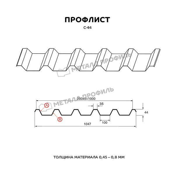 Профилированный лист С-44 используется фактически во всех сферах строительства. Он одинаково популярен как в частном секторе, так и на крупномасштабных объектах. Профлист с глубиной волны 44 мм характеризуется очень хорошими несущими способностями. Это наиболее рельефный из профилей с маркировкой С – «стеновой». С-44 подойдёт, если вам нужно: оборудовать хозяйственные помещения, поставить ограждения, установить стены и перегородки в щитовых постройках, перекрыть кровлю. Также данный гофрированный лист| профиль отличается достаточной прочностью для строительства каркасов различных сооружений и несъёмной опалубки для железобетона. Профлист С-44 разрешено устанавливать в районах с экстремальными климатическими условиями. Стороны этого профиля несимметричны. Верхняя часть (А) представляет собой более ритмичный рисунок из узких полочек и рекомендована для кровли. Сторона В выглядит более монолитно, рекомендована для прочих сфер применения.Покрытие NormanMP®: